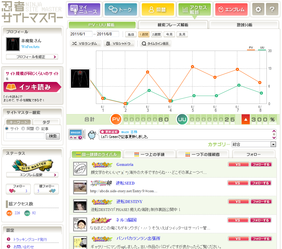 フォロー数とは忍者サイトマスターに参加しているサイトで自分がライバル視しているサイトの数。